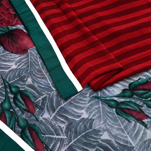 Women Vintage Sari Red & Gray Pure Georgette Silk Printed Saree Craft Fabric Sewing 5Yard Soft Light Dress Making Floral Quilting Crafting