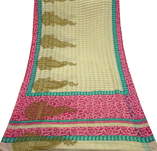 Indian Women Vintage Sari Beige & Pink Pure Georgette Silk Printed Saree Sewing 5yd Soft Craft Fabric Floral Wrap Boho Zari Dress making