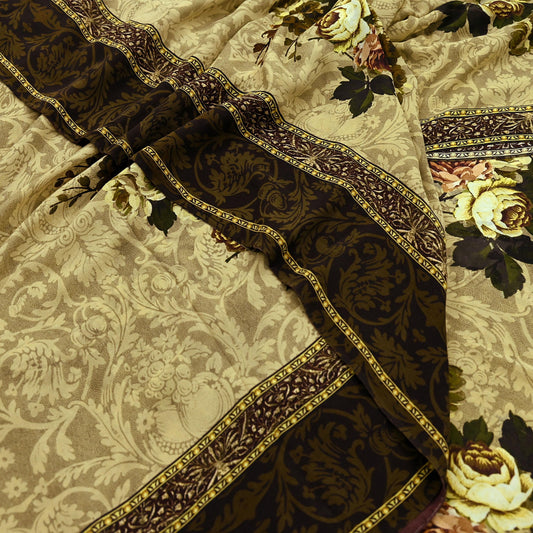 Women Vintage Sari Ivory & Brown Pure Georgette Silk Printed Saree Craft Fabric Sewing 5Yard Soft Light Dress Making Floral