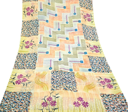 Women Vintage Sari Beige Pure Georgette Silk Digital Printed Saree Craft Fabric Sewing 5Yd Light Dress Making Geometric Crafting Quilting