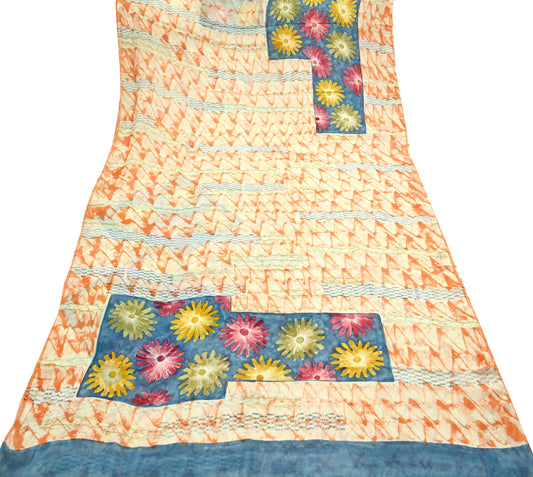 Indian Vintage Sari Blue & Saffron 100% Pure Georgette Silk Printed Sarees Sewing 6yd Craft Soft Dress Designing for Crafting Floral