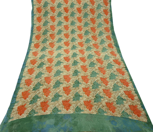 Indian Vintage Green & Beige Saree Pure Georgette Silk Printed Sari Craft Fabric Sewing 5Yard Soft Light Dress Making Floral