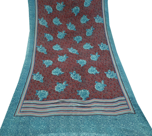 Indian Vintage Saree Burgundy & Blue Pure Georgette Silk Printed Sari Sewing 6yd Craft Fabric Soft Dress Designing for Crafting Quilting