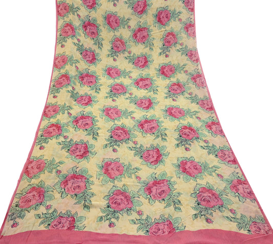 Indian Vintage Ivory & Multi Saree Pure Georgette Silk Printed Sari Craft Fabric Sewing 6Yard Soft Light Dress Making Floral