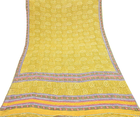 Indian Vintage Sari Yellow Hand Embroidered Printed 100% Pure Georgette Silk Saree Craft Fabric 6Yd Ethnic Soft Dress making For Crafting