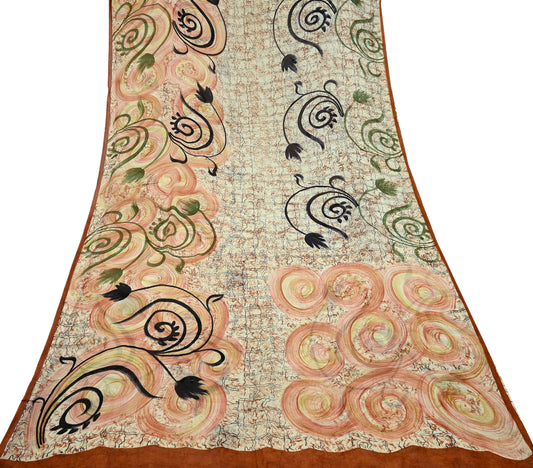 Indian Vintage Sari Brown & Ivory Hand Embroidered Printed Pure Georgette Silk Sari Saree Fabric 5Yd Zari Dressmaking Crafting Upcycle