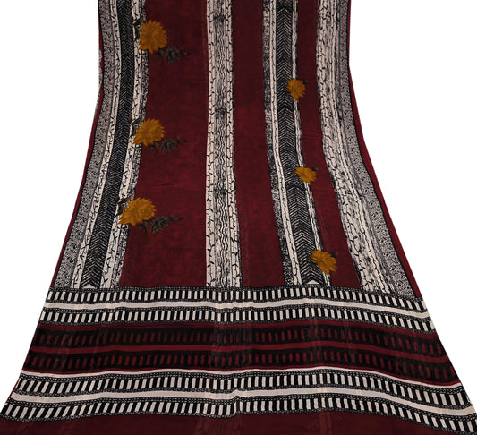 Indian Vintage Sari Brown & Maroon Pure Georgette Silk Printed Sarees Craft Fabric Sewing 5Yd Soft Dress Making Crafting Quilting Upcycle