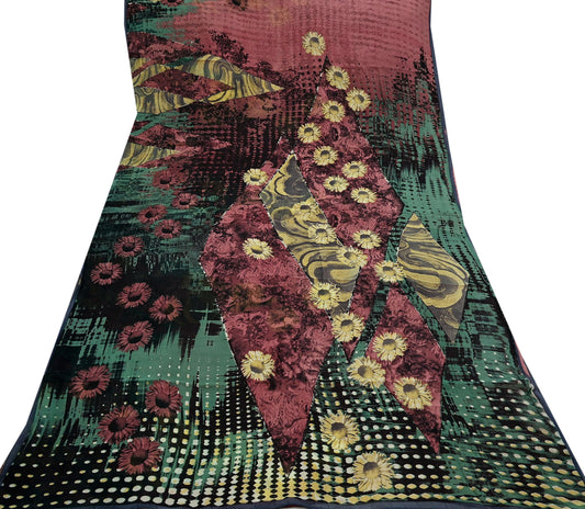 Indian Vintage Green & Black Saree Georgette Digital Printed Sari Sewing 5yard Craft Soft Abstract Crafting Dress Making Upcycle