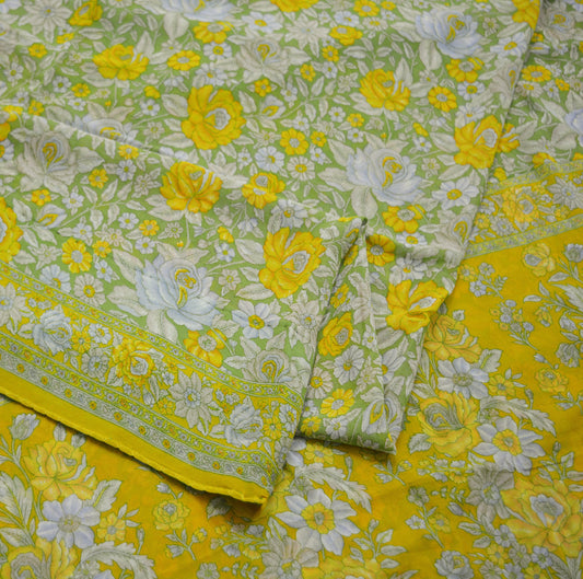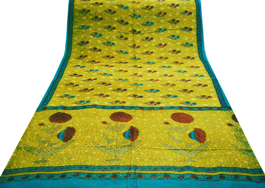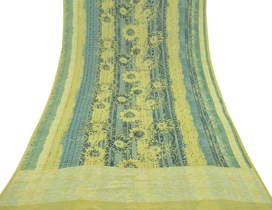 Vintage Sari Yellow & Green 100% Pure Georgette Silk Printed Sarees Sewing 5yd Craft Fabric Soft Dress Designing for Crafting Floral