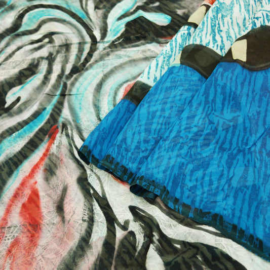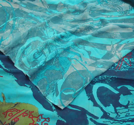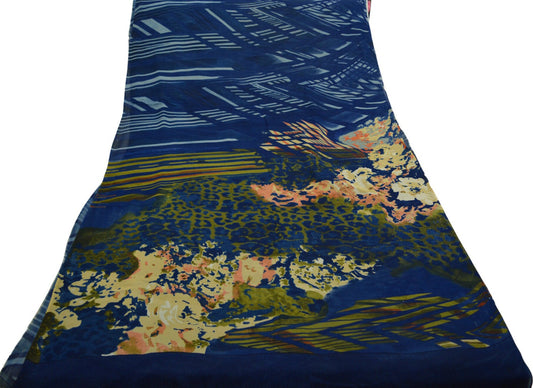 Women Vintage Sari Blue Pure Georgette Silk Printed Saree Craft Fabric Sewing 5Yard Soft Light Dress Making Abstract