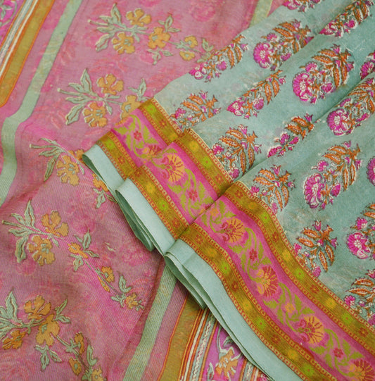 Vintage Sari Green Blend Georgette Digital Printed Sarees Sewing 5yd Soft Craft Fabric Floral Crafting Dress Making Quilting Crafting Used