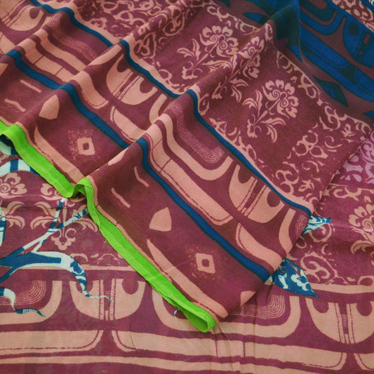 Indian Vintage Sari Brown 100% Pure Georgette Silk Printed Sarees Sewing 5yard Soft Craft Floral Design Wrap Boho