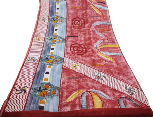 Women Vintage Sari Maroon Pure Georgette Silk Printed Saree Craft Fabric Sewing 6Yard Soft Light Dress Making Floral