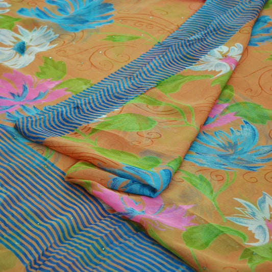 Indian Vintage Sari Orange Pure Georgette Silk Printed Sarees 5Yd Craft Fabric Sewing Light Weight Sari Quilting Dress making Crafting