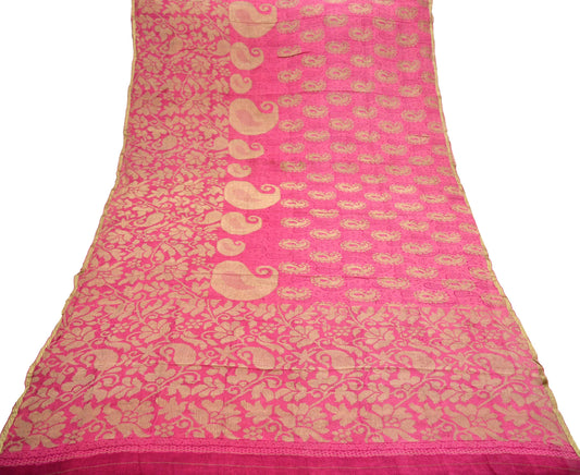 Indian Vintage Sari Pink Pure Georgette Silk Woven Block Printed Sarees 5Yd Craft Fabric Sewing Soft Dress Making Woven Zari Border Quilting