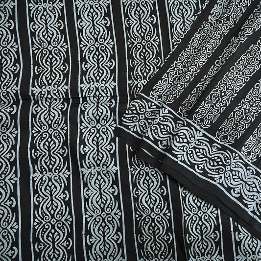 Indian Vintage Black Pure Silk Saree Printed Floral & Striped Design 5Yards Soft Craft Fabric for Dressmaking, Quilting, Upcycling