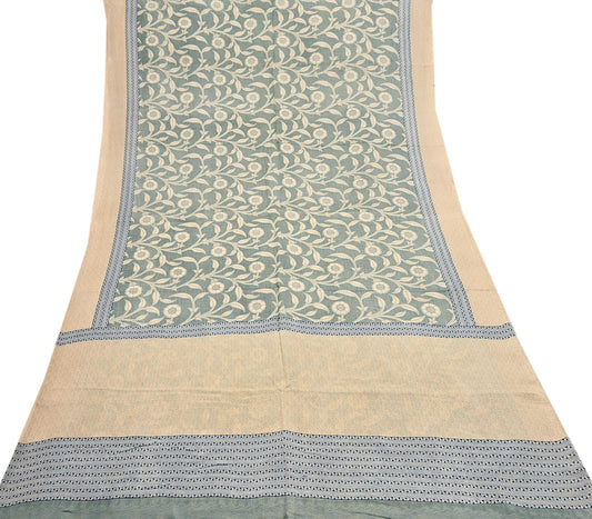 Vintage Gray & Green Pure Silk Saree Indian Printed Floral Silk Fabric 5 Yard Soft Sewing Material for Dressmaking, Quilting Crafts