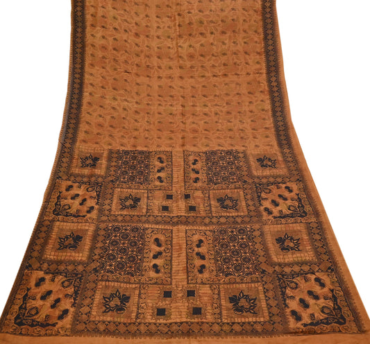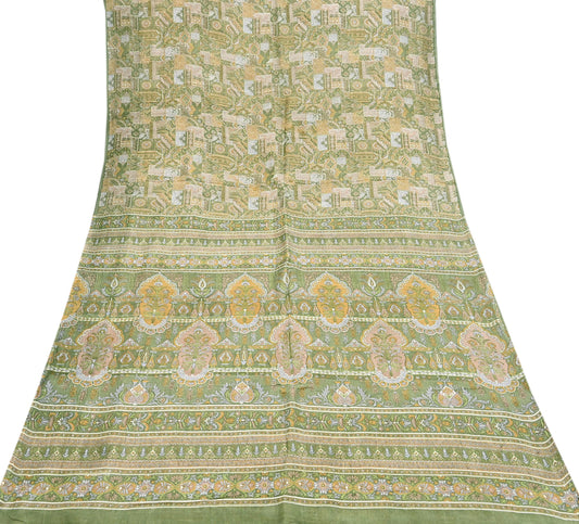Indian Vintage Beige & Green Saree Pure Silk Printed Indian Sari Fabric 5yd Sewing Craft Fabric DressMaking Soft