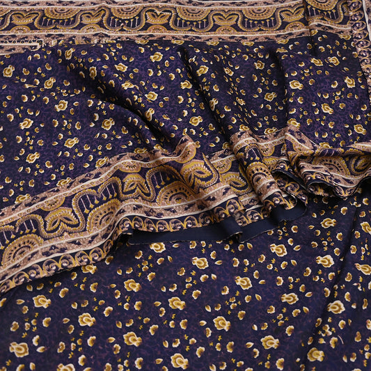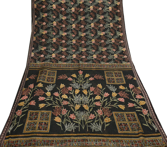 Vintage Sari Black Pure Silk Printed Saree Craft Fabric 5yard Sewing Floral Soft Dress Designing for Crafting Upcycle Quilting