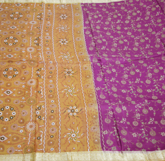 Indian Vintage Sari Purple & Saffron Pure Silk Printed Saree 5yard Sewing Quilting Craft Fabric DressMaking Soft Golden Zari