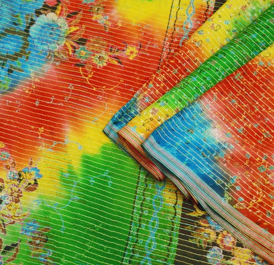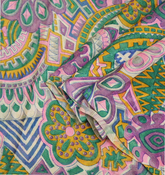 Indian Women Vintage Sari Multi Colored 100% Pure Silk Printed Saree Fabric 5yd Sewing Abstract Soft Dressmaking