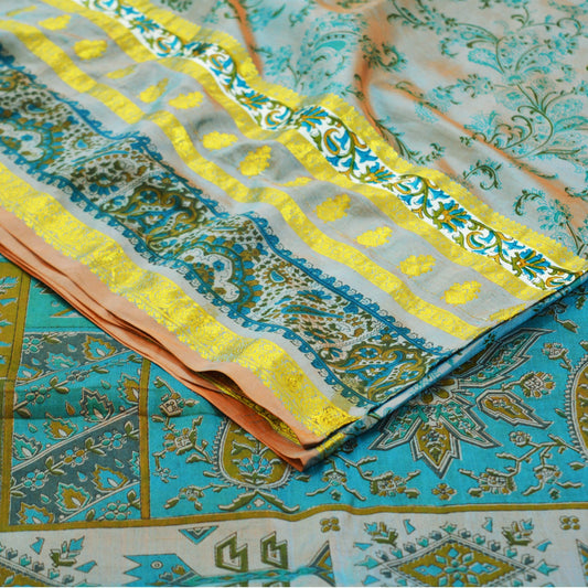Indian Vintage Sari Green & Orange 100% Pure Silk Printed Saree 6yard Sewing Craft Fabric DressMaking Soft Golden Zari