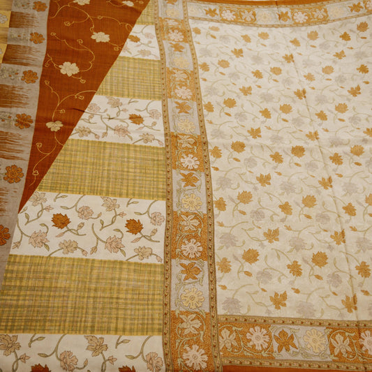 Indian Vintage Sari Ivory Pure Silk Printed Saree Fabric 5yd Sewing Craft Fabric DressMaking Soft