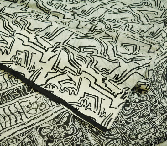 Indian Vintage Sari Black & White 100% Pure Silk Printed Saree 6yard Sewing Fabric Floral Dress Designing for Crafting