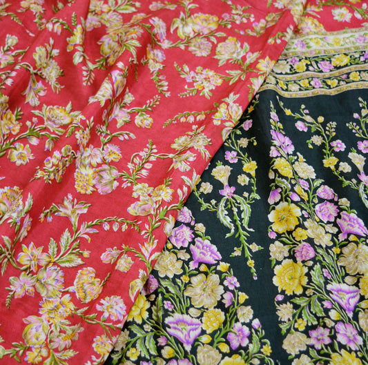 Indian Vintage Sari Black & Red Pure Silk Printed Sarees 6yd Sewing Craft Fabric DressMaking Soft