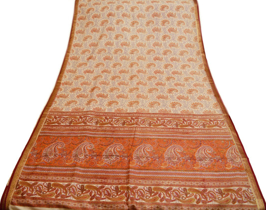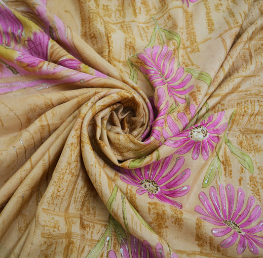 Vintage Sari Beige Pure Silk Printed Saree Fabric 5yard Sewing Soft Dress Designing for Crafting ,Decor Floral