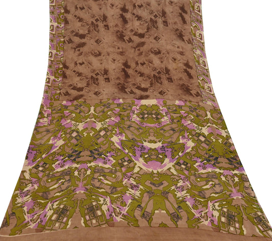 Indian Vintage Sari Brown 100% Pure Silk Printed Saree 5yd Sewing Craft Fabric DressMaking Wrap Abstract For Crafting Quilting Upcycle