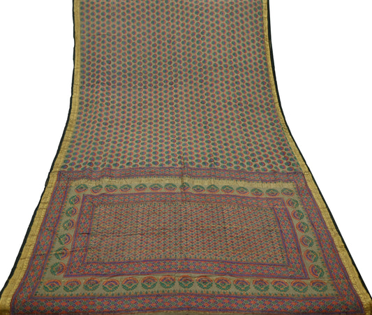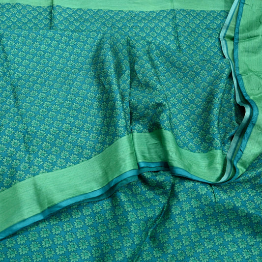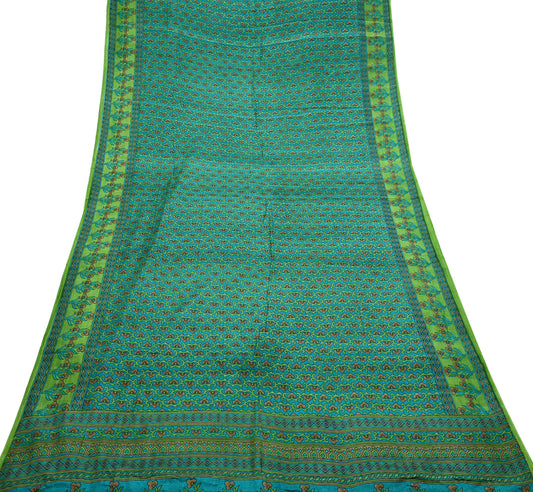 Indian Vintage Sari Green & Blue 100% Pure Silk Printed Sarees 5yd Sewing Craft Fabric Dress Making Soft Woven Border Upcycle Quilting