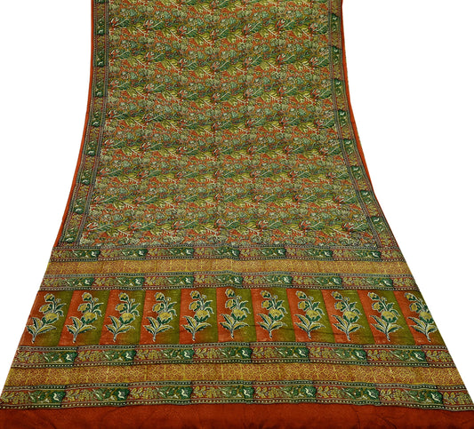 Indian Vintage Sari Orange & Green 100% Pure Silk Printed Saree Craft Fabric 5yd Sewing Dress Making Soft Wrap Quilting Crafting Upcycle