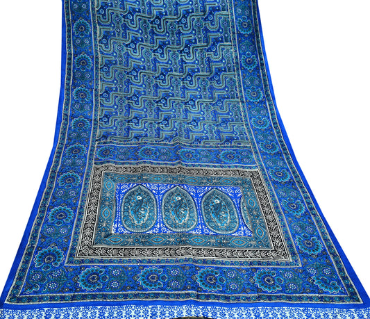Indian Vintage Sari Blue Pure Silk Printed Sarees 5yd Sewing Craft Fabric Soft Dress Making Wrap Paisley Upcycle Quilting Crafting