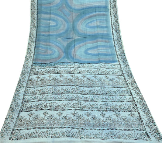 Indian Vintage Sari Gray & Blue Pure Silk Printed Saree 5yd Craft Fabric Sewing Floral Soft Dress Making Wrap used Quilting Crafting Upcycle