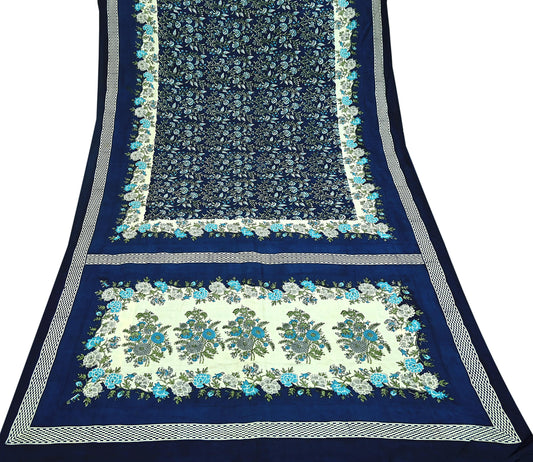 Indian Vintage Sari Blue Pure Silk Printed Sarees 6yd Sewing Craft Fabric Soft Dress Making Wrap Floral Upcycle Quilting Crafting