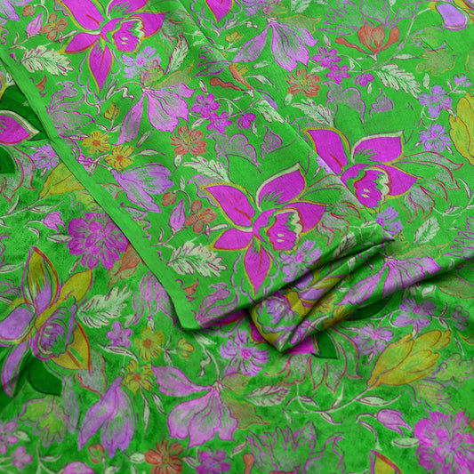 Indian Vintage Sari Green Pure Silk Printed Sarees 5yd Sewing Craft Fabric Dress Making Soft Floral Wrap Upcycle Used Quilting Crafting