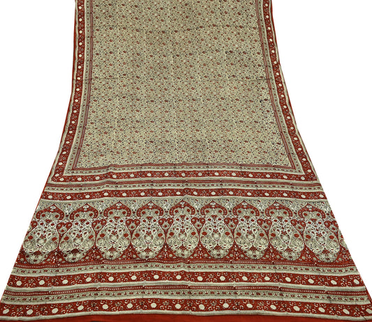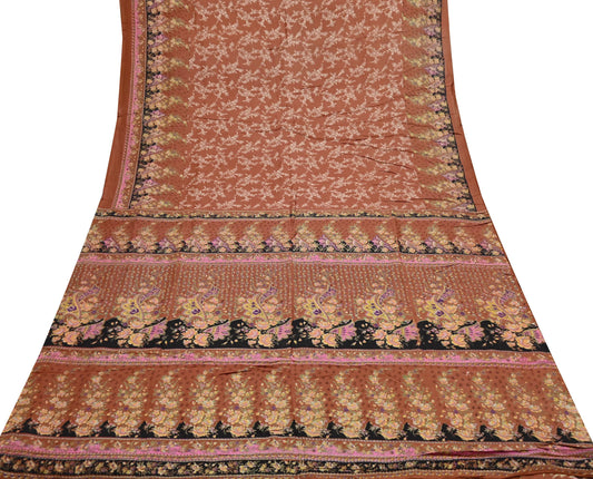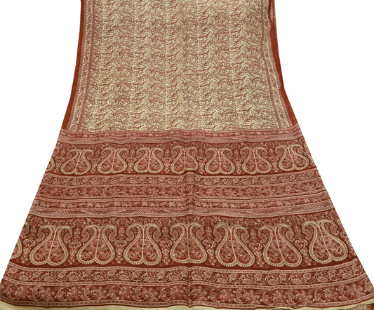Vintage Sari Brown & Ivory 100% Pure Silk Printed Saree Craft Fabric 6yd Sewing Floral Dress Designing for Crafting Quilting Upcycle Paisley