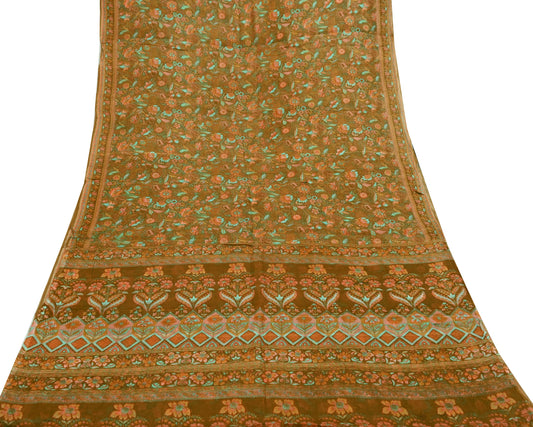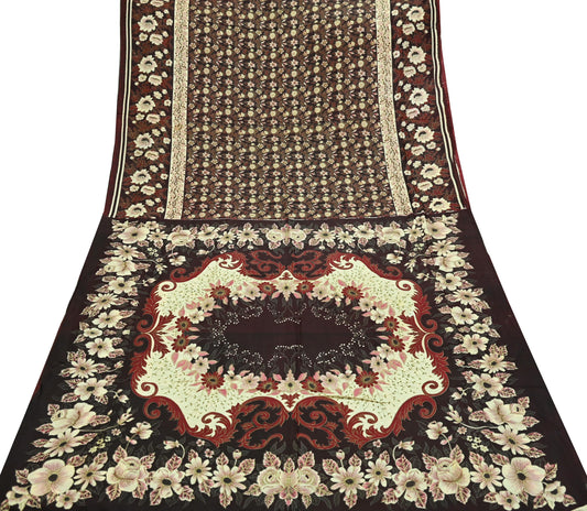 Vintage Sari Brown & Ivory 100% Pure Silk Printed Saree Craft Fabric 6yd Sewing Floral Soft Dress Designing for Crafting Quilting Upcycle