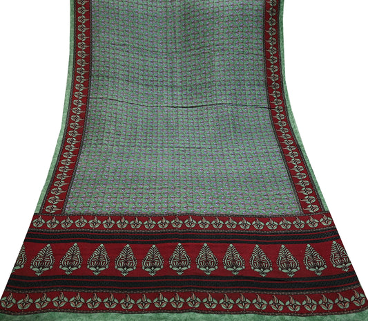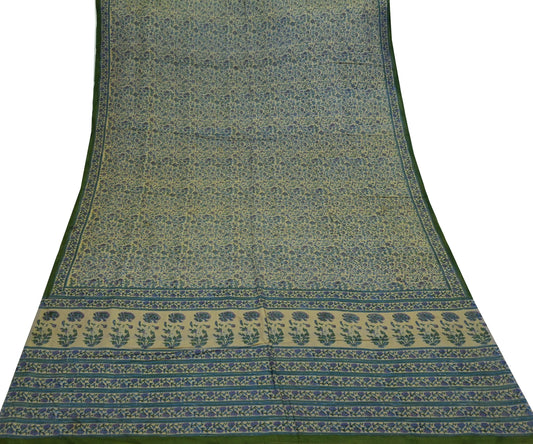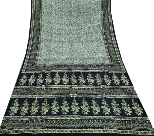Indian Vintage Sari Green & Gray Pure Silk Printed Sarees Craft Fabric 5yd Sewing Dress Making Floral Crafting Quilting Upcycle Used