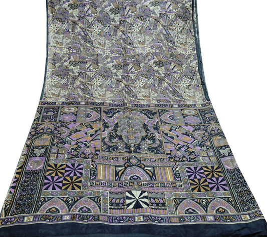 Indian Vintage Sari Black & Gray 100% Pure Silk Printed Saree 5yd Sewing Craft Fabric Dress Making Soft Crafting Quilting Upcycle Used