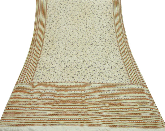 Indian Vintage Sari Ivory & Beige Pure Silk Printed Saree 5yd Sewing Paisley Craft Fabric DressMaking Soft Used Upcycled