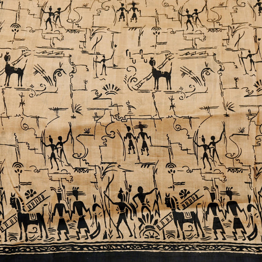 Indian Vintage Sari Black & Beige Pure Silk Printed Sarees Craft Fabric 6yd Sewing Dress Making Humans Elephants Quilting Upcycle Crafting