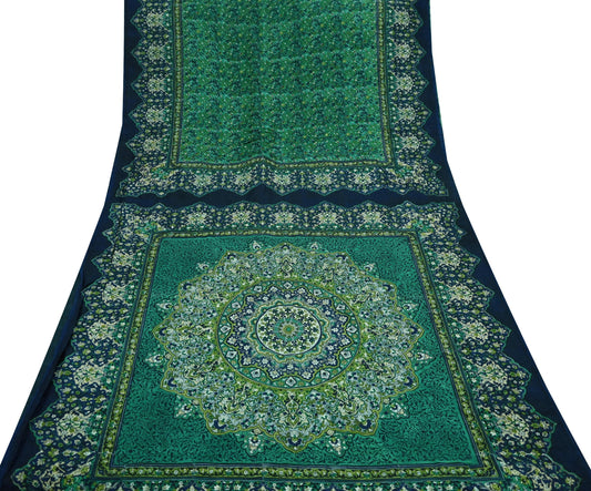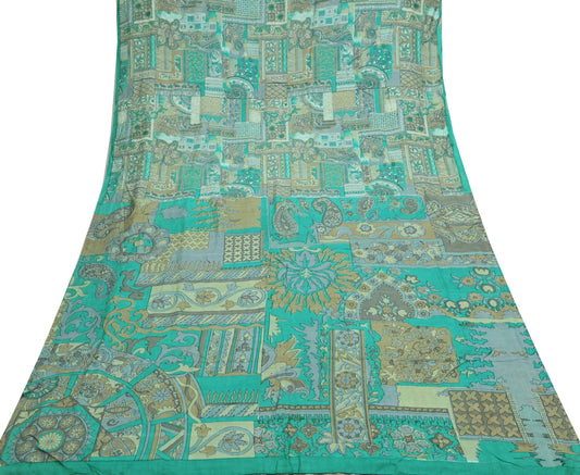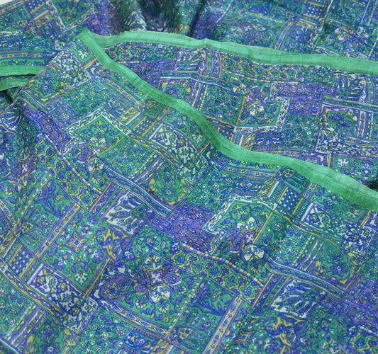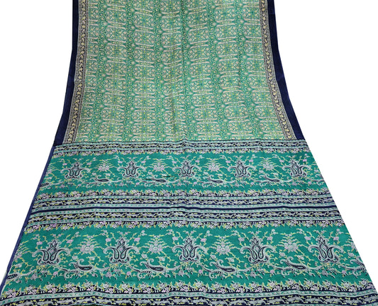 Indian Vintage Sari Green & Blue 100% Pure Silk Printed Sarees 5yd Sewing Craft Fabric Dress Making Soft Wrap Crafting Quilting Upcycle