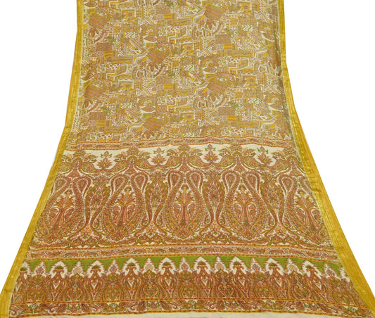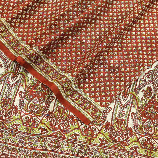 Indian Vintage Sari Orange & Ivory Pure Silk Printed Sarees Craft Fabric 5yd Sewing Dress Designing for Crafting Paisley Quilting Upcycle