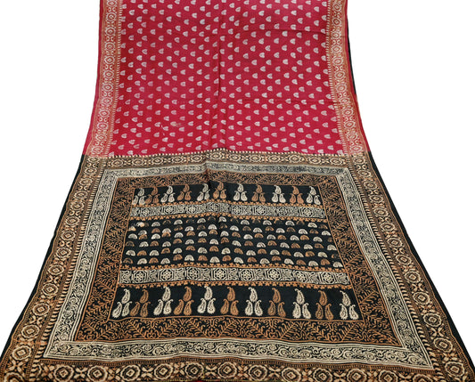 Indian Vintage Sari Black & Red Pure Silk Block Printed Sarees 5yd Sewing Craft Fabric Dress Making Soft Quilting Crafting Upcycle Used