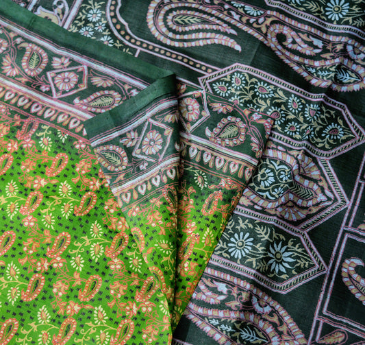 Indian Vintage Sari Black & Green 100% Pure Silk Printed Saree Fabric 5yard Sewing Craft DressMaking Soft Paisley