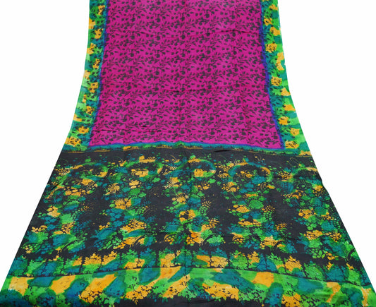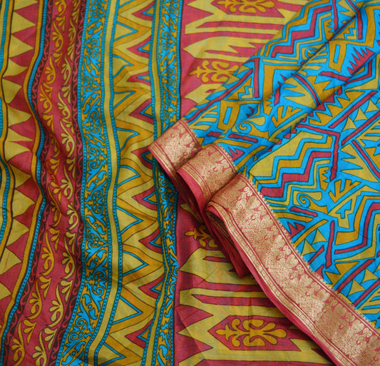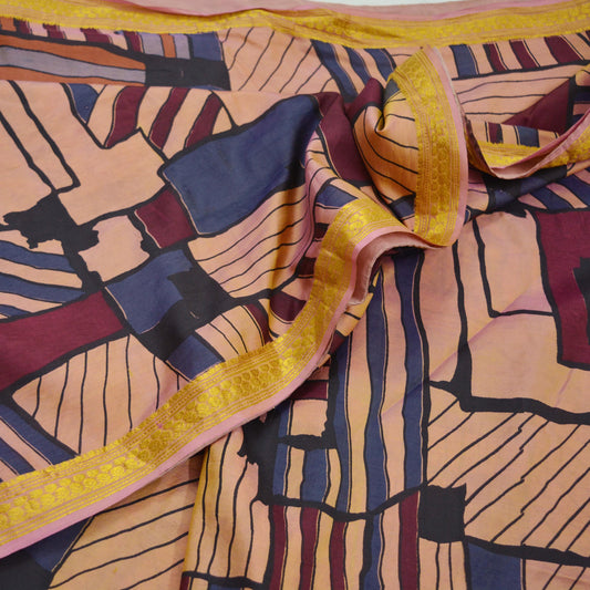 Indian Vintage Sari Multi Colored 100% Pure Silk Printed Sarees Craft Fabric 5yd Sewing Abstract Soft Dressmaking Zari Border Crafting
