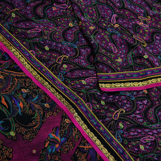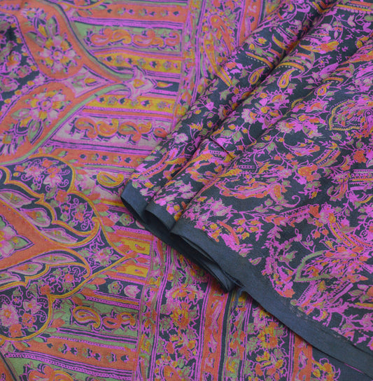 Vintage Sari Black & Purple 100% Pure Silk Printed Sarees 5yd Craft Fabric Sewing Floral Dress Designing for Crafting Quilting Upcycle Used