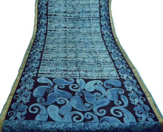 Indian Vintage Sari Blue Pure Silk Printed Sarees 5yd Sewing Craft Fabric Soft Dress Making Wrap Paisley Upcycle Quilting Crafting